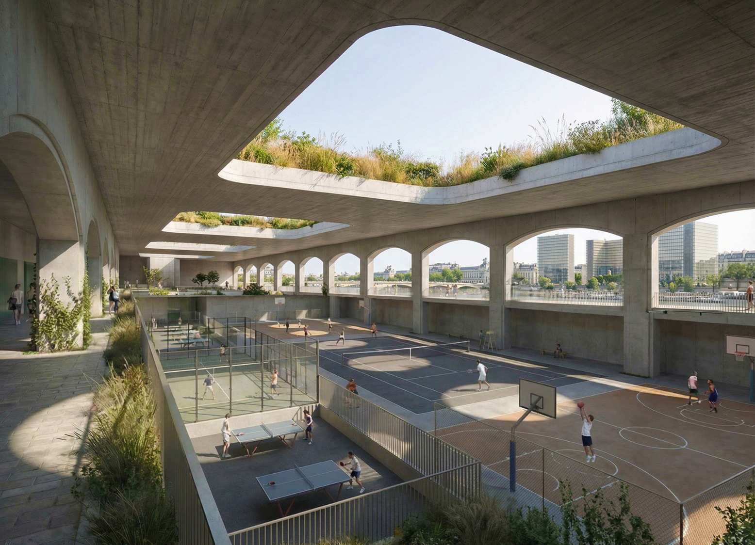 Il comprendra deux niveaux dédiés aux sports indoor, l’aménagement de puits de ventilation et de lumière naturelle, ainsi qu’une connexion directe avec les jardins supérieurs et le parc.